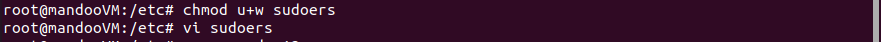 2. /etc 폴더로 접근하고, vi를 이용해 수정하기위해 sudoers 파일의 수정권한을 부여하고, sudoers file을 아래와 같이 수정한다.