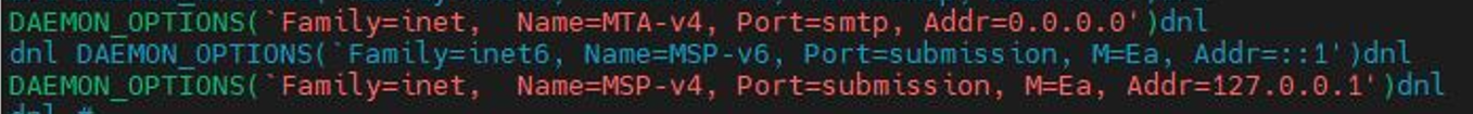 4. 외부와 메일을 주고받기 위해서 smtp와 submission의 DAEMON_OPTIONS에서 Addr을 0.0.0.0으로 설정한다.