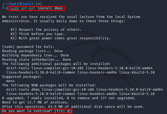 1. Kali linux에서 터미널을 실행하고, 아래 명령어를 입력해 dkms 패키지를 설치한다.